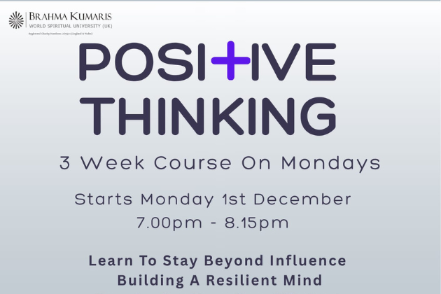 Positive Thinking Course with Brahma Kumaris starting Monday 1st December for 3 weeks. 7-8.15pm.